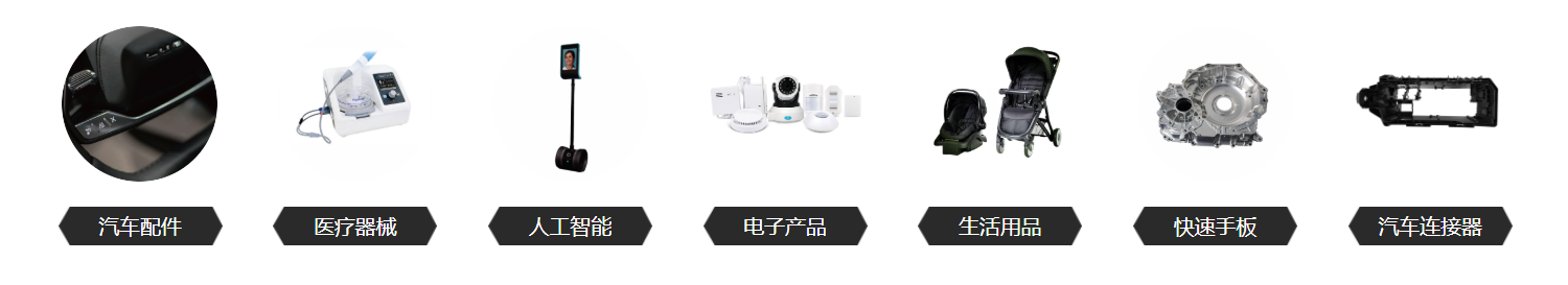 九大领域:涵盖医疗零部件、汽车零部件、电子产品、智能产品、安防产品、节能产品、家电产品、机器人产品及工业制品。